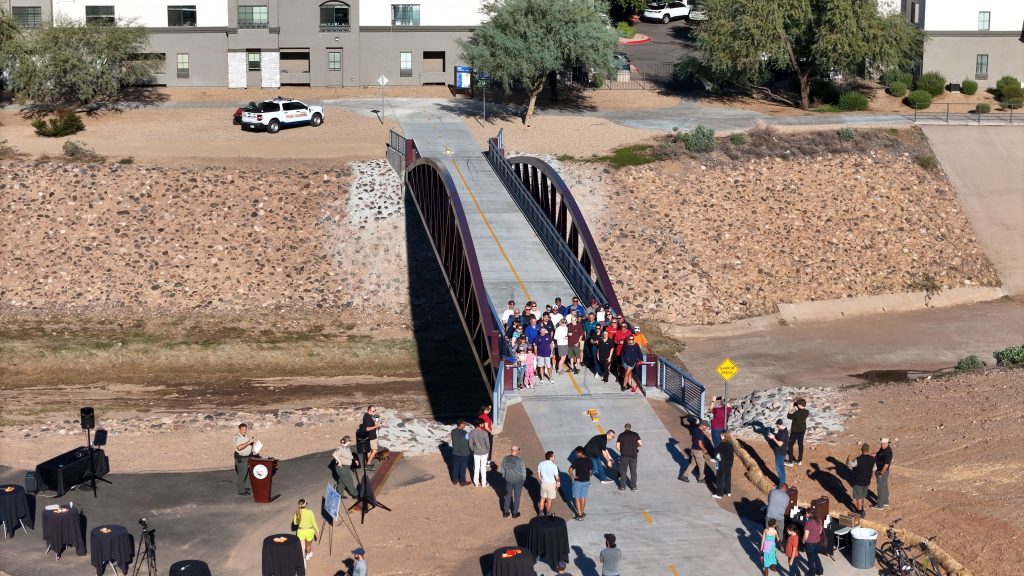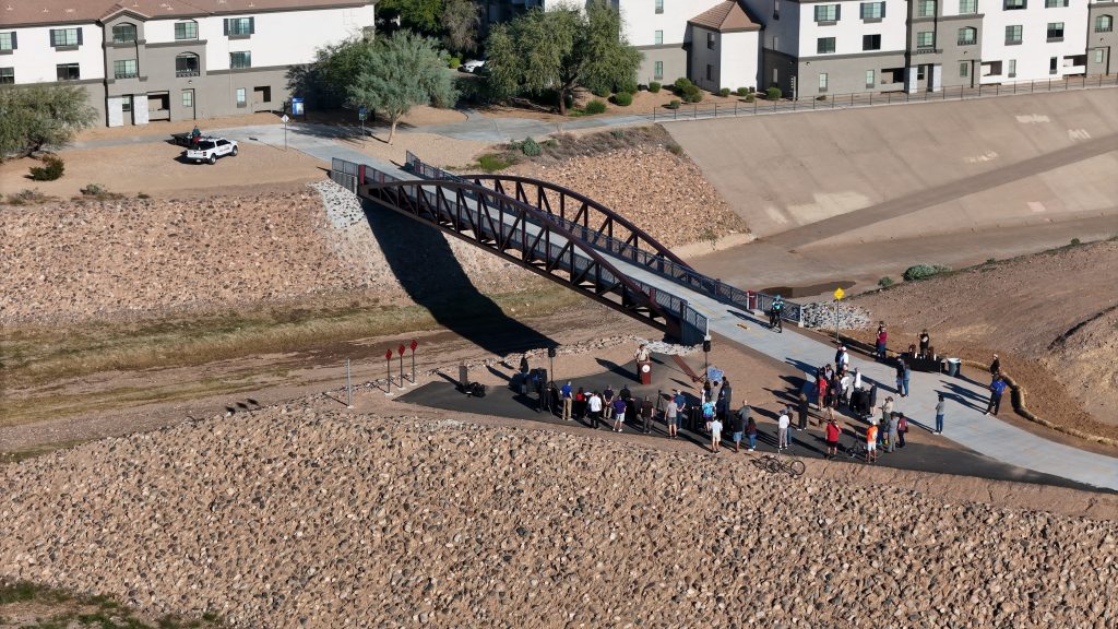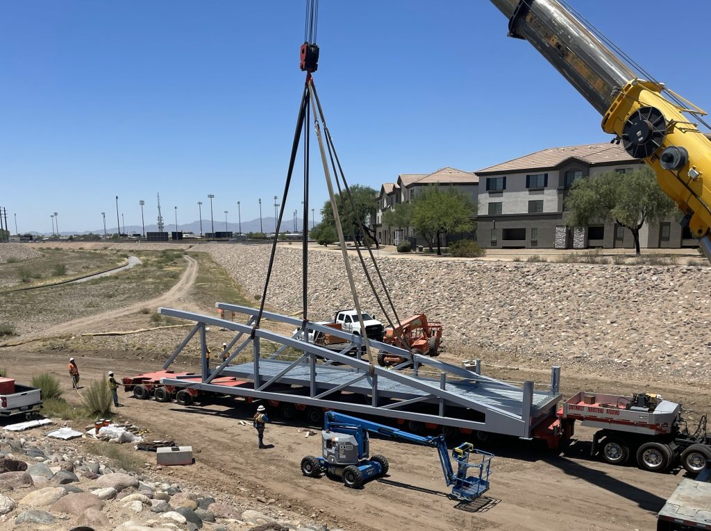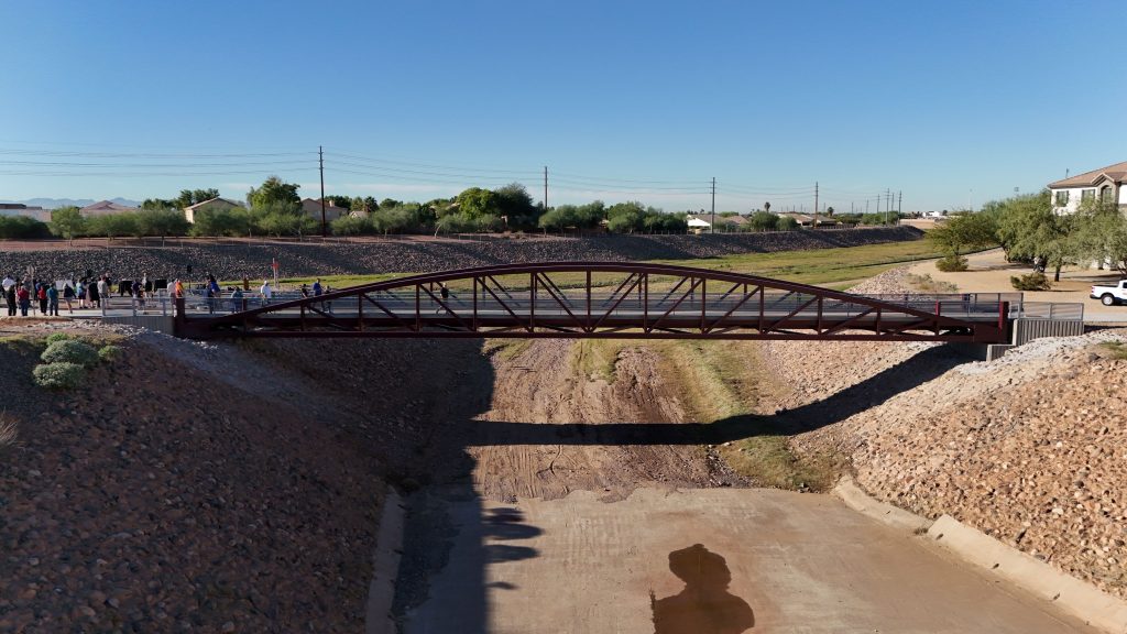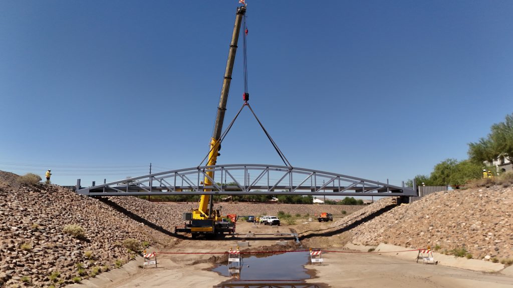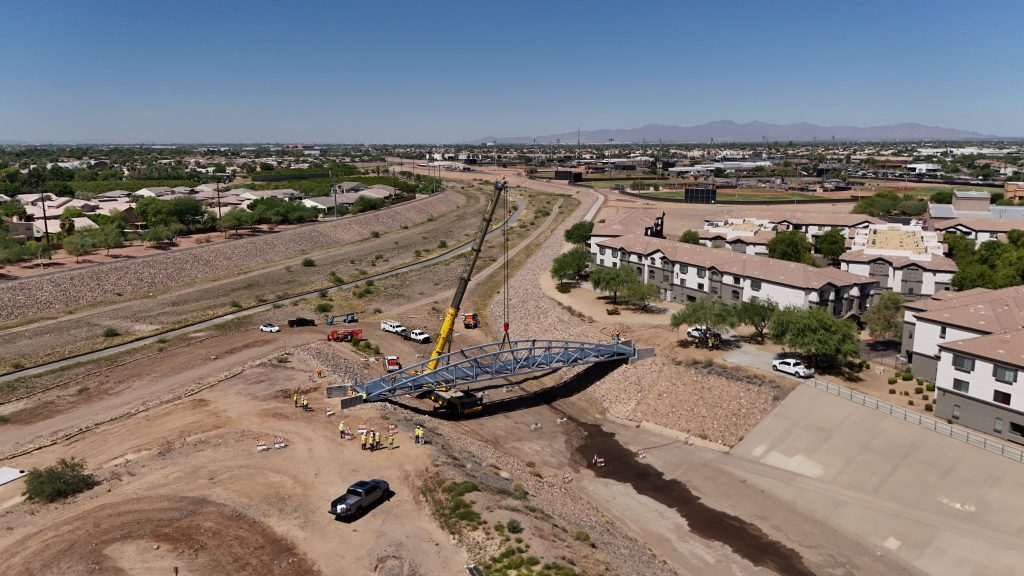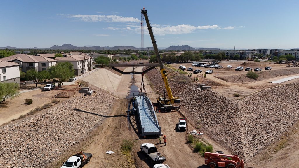 The Stadium Trail Phase II project delivered a critical segment of Peoria’s regional trail network by constructing a new multi-use pathway and installing a 140-foot prefabricated steel pedestrian bridge over Skunk Creek. This work closed a longstanding gap between major trail corridors and enhanced access to the Peoria Sports Complex, the P83 Entertainment District, and surrounding neighborhoods. The project required disciplined sequencing, extensive flood-control stabilization, and close coordination with the City of Peoria, ADOT, FCDMC, USACE, Jacobs, and Stinger Bridge & Iron.