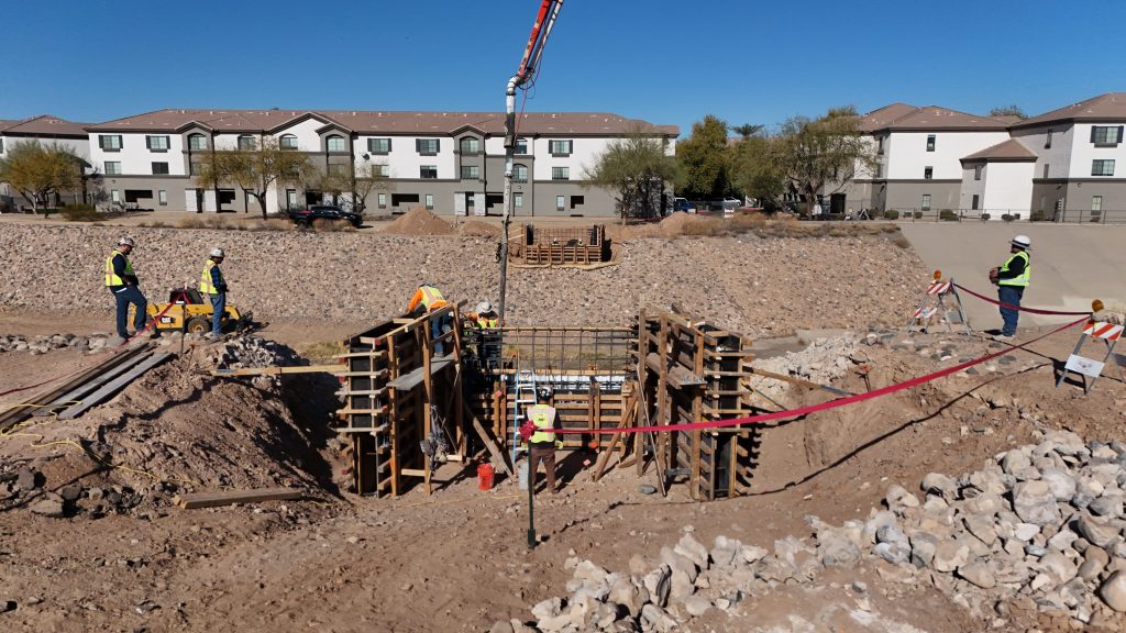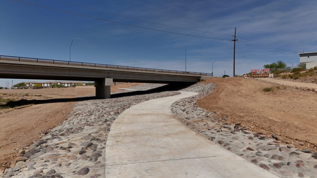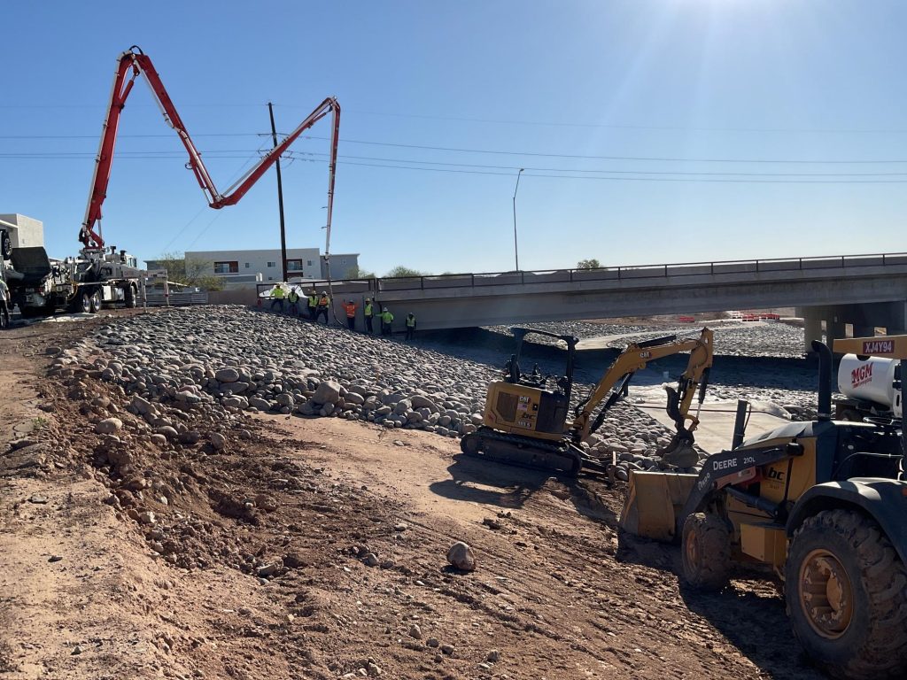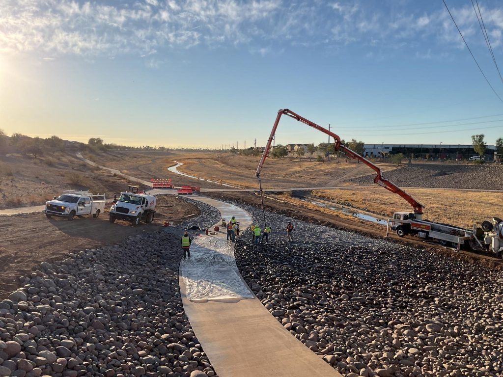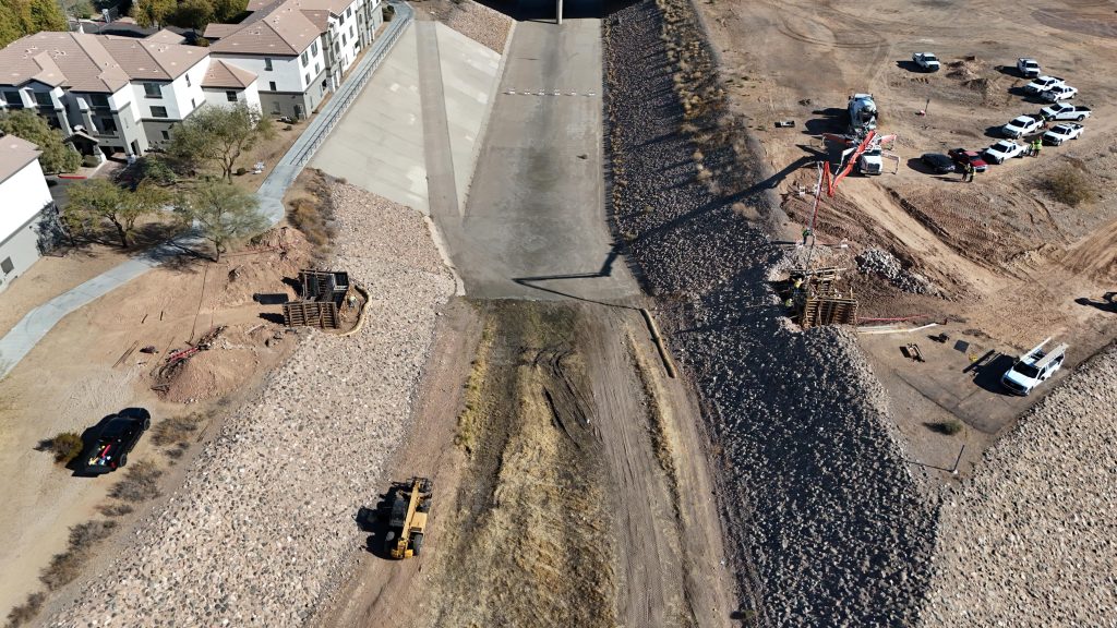 Crews executed major removals, channel grading, grouted and dumped riprap, drilled shafts, structural concrete, bridge construction, and trail paving while maintaining public access within a heavily used recreation corridor. Banicki also collaborated with FCDMC to revise outdated riprap specifications, a solution that enabled timely delivery and improved future flood-control work valley-wide. The result is a durable, safe, and highly connected trail system that strengthens mobility and recreation opportunities for thousands of users.